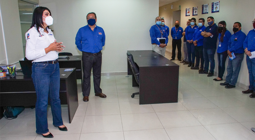 Con apego estricto a las medidas de seguridad e higiene de la empresa, Eva María dialogó con sus colaboradores y directivos, reconociendo su labor y esfuerzo a través de los años, sobre todo durante la contingencia sanitaria, cuando colaboraron para apoyar a familias mexicalenses en estado de vulnerabilidad con canastas de alimentos y material de limpieza.