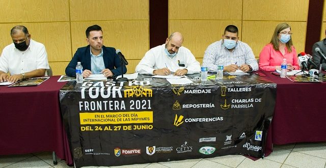 Mexicali, B.C. a 21 de junio del 2021 / Redacción.- En rueda de prensa celebrada en Sala de Cabildo del Ayuntamiento de Mexicali, se dieron a conocer los detalles del evento “4 Days Gastro Tour Frontera 2021”, que se llevará a cabo del 24 al 27 de junio, de manera virtual y presencial, con la participación del Sub Consejo Municipal de Jóvenes Empresarios y FOMYDE.