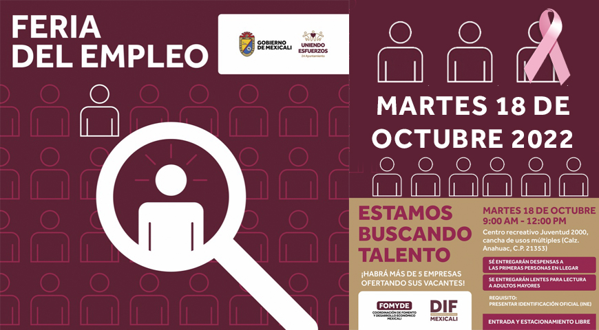 Mexicali B.C. A miércoles 12 de octubre 2022 / Redacción.- Con el propósito de acercar las fuentes de trabajo a las y los cachanillas, el Gobierno de Mexicali en coordinación con el sector empresarial, anunció que este próximo 17 y 18 de octubre se llevará a cabo la “Feria del Empleo”.