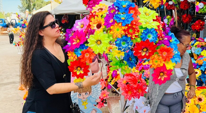 En uno de los panteones más visitados por los rumbos de la carretera al aeropuerto de Mexicali, se ven llegar decenas de familias con arreglos florales que son colocados en las tumbas de sus difuntos, con el único objetivo de recordarlos y traerlos a este plano en la memoria, sin embargo, este día tampoco esta exento del comercio que oferta en lugares aledaños o a lo largo de las rúas cercanas a los camposantos, flores naturales y artificiales, así como arreglos florales, recuerdos, estampas, imágenes religiosas y las que evocan parentesco con el finado.