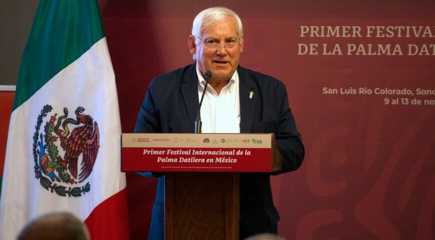 En la ceremonia inaugural del Primer Festival Internacional de la Palma Datilera en México, en San Luis Río Colorado, Sonora, expuso que ante la preocupación global por la seguridad alimentaria, acentuada por la pandemia y los conflictos geopolíticos, la palma datilera representa uno de los cultivos más generosos y prolíficos en zonas áridas del mundo.