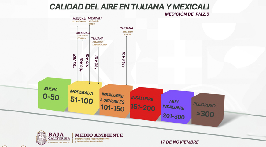 Para este jueves 17 de noviembre la calidad del aire de la ciudad de Mexicali está dentro del rango de “moderada” como resultado de la presencia de partículas PM2.5 en el aire, el cual a las 07:00 horas se registró un AQI de 85 en la estación BC12, UABC, un AQI de 66 en la estación BC14, COBACH y un AQI de 63 en la estación BC10, ITM.