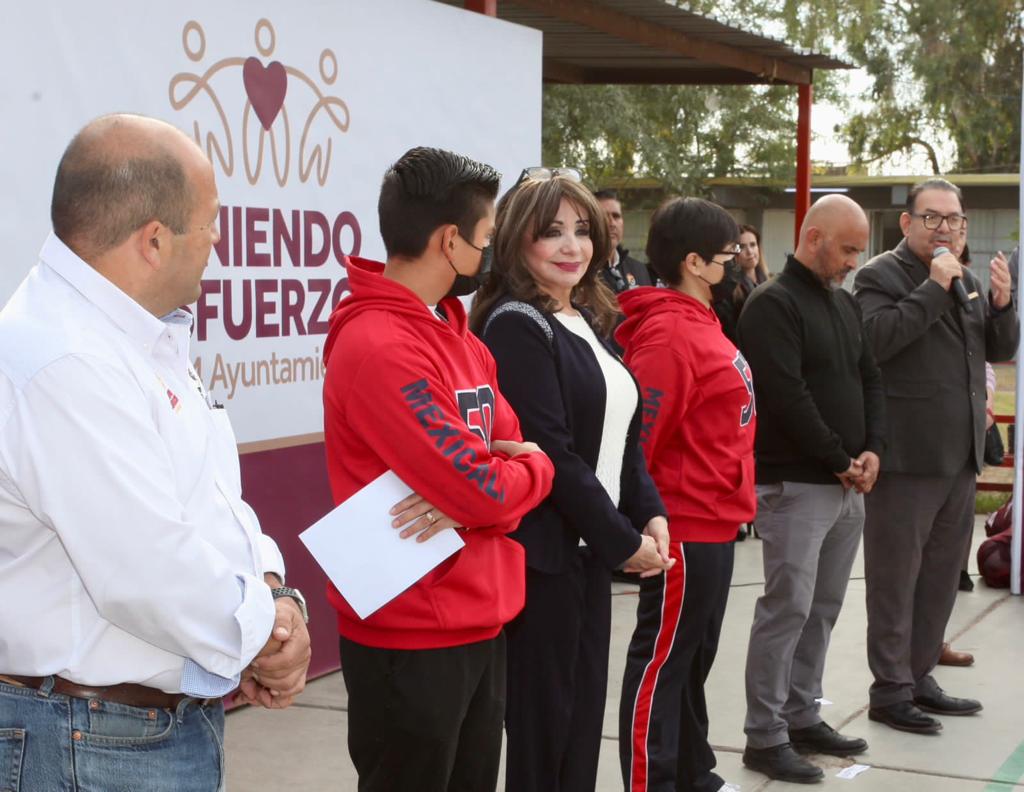 Mexicali, B.C. A jueves 01 de diciembre de 2022 / Redacción.- Como parte de las acciones para promover la actividad física en las instituciones educativas, la presidenta municipal Norma Bustamante Martínez llevó a cabo la entrega de 37 paquetes de material deportivo a diversas escuelas de nivel preescolar, primaria, secundaria y preparatoria, en la Secundaria No.50 “Lic. José F. Guajardo”.