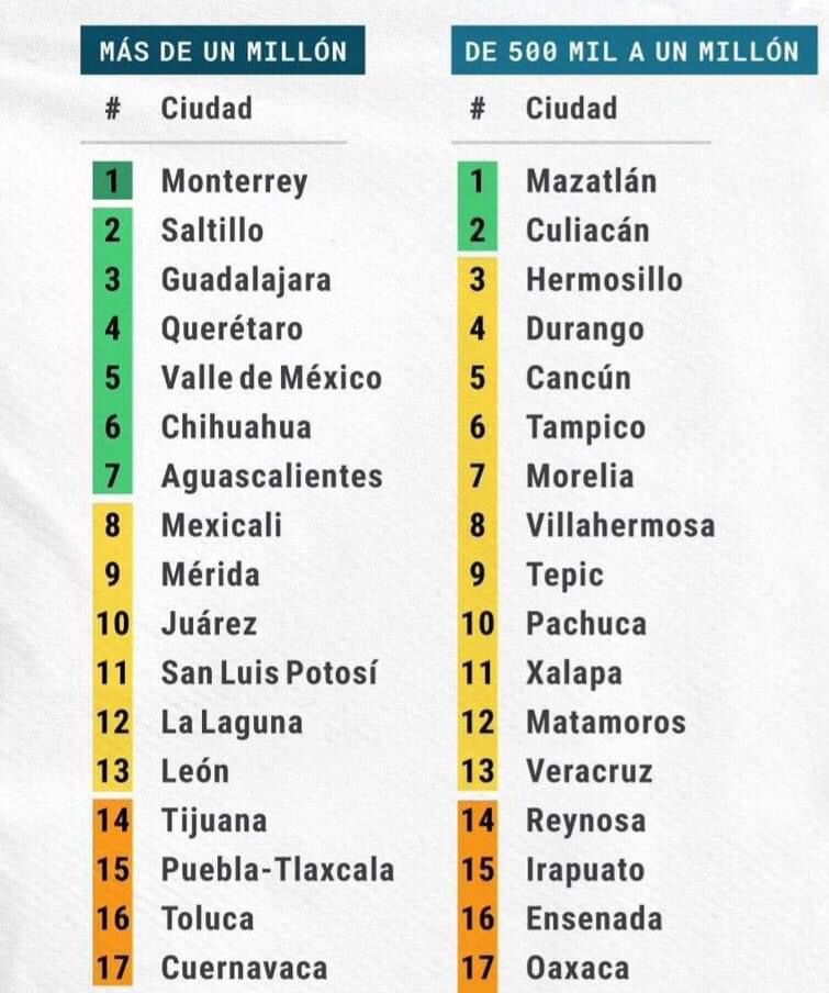 Asimismo, explicó que el Índice de Competitividad Urbana 2022 consistió en un extenso análisis, en donde se evaluaron a 66 ciudades del país y se midieron varios factores como; la tecnología, seguridad, turismo, conectividad, economía, mercado laboral, el uso de recursos naturales, la inclusión, salud, educación, democracia y gestión gubernamental.