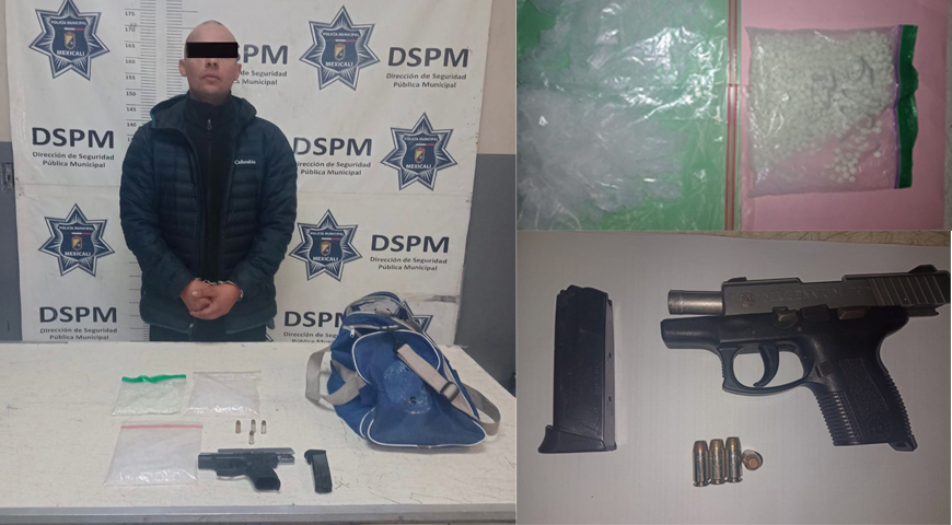 Mexicali, Baja California a 06 de marzo del 2023 / Redacción.- La Dirección de Seguridad Pública Municipal de Mexicali (DSPM), a través de la estrategia “Mexicali Seguro”, logró la detención de Diego Armando “N” de 33 años de edad, por el delito de portación de arma de fuego, cartuchos, dosis de cristal y hasta 5 mil dosis de la droga sintética fentanilo, pastillas marcadas con la leyenda “M30”.