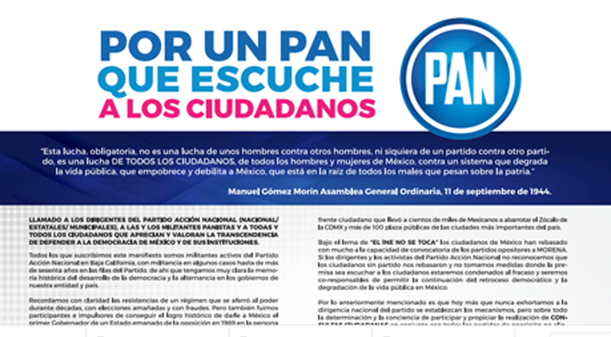 Mexicali, Baja California, a 28 de marzo de 2023 / Redacción.- A través de un Manifiesto Publico, militantes panistas de todo el estado, lanzaron una propuesta a las dirigencias nacionales, estatales y municipales de todo el país, a que en la actual coyuntura política nacional, el PAN promueva la conformación de un Consejo Nacional de Participación Ciudadana, que tenga como objetivo la determinación de un solo candidato o candidata, validado por los ciudadanos para la Presidencia de México.