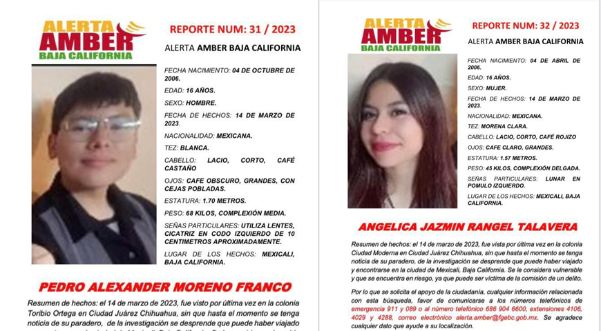 Mexicali, Baja California a miércoles 29 de marzo del 2023 / Redacción.- La Dirección de Seguridad Pública Municipal de Mexicali (DSPM), en colaboración con la Unidad de Desaparecidos de la Fiscalía General del Estado (FGE), localizaron a dos adolescentes originarios de Ciudad Juárez, Chihuahua; cuya Alerta Amber se emitió el pasado 14 de marzo, ambos fueron ubicados en las inmediaciones de la Plaza La Cachanilla.