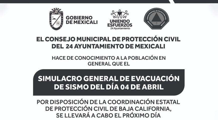 Mexicali, B.C. A 03 de abril de 2023 / Redacción.- Con el propósito de promover la cultura de protección civil en la población, el Gobierno de Mexicali anunció que se sumará al Primer Simulacro Nacional este próximo miércoles 19 de abril a las 9:00 am.