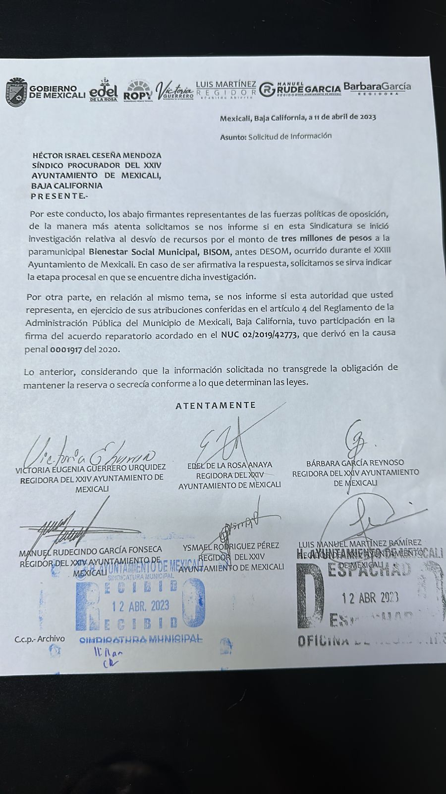 MEXICALI, B. C., A MIÉRCOLES 12 DE ABRIL DE 2023 / Redacción.- Los Regidores que conforman la Oposición en el 24 Ayuntamiento de Mexicali están en contra del acuerdo reparatorio que se llegó para que se paguen los 3 millones de pesos que fueron robados en el 2018 a la Dirección de Bienestar Social Municipal por un empleado en ese momento, al ser recursos públicos y tampoco que se paguen en parcialidades y sin sanciones a dicha persona que sustrajo este recurso.
