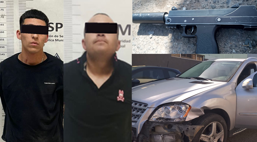 Mexicali, Baja California a martes 2 de Mayo del 2023 / Redacción.- La Dirección de Seguridad Pública Municipal de Mexicali (DSPM), en un inmediato despliegue operativo de unidades patrulla, logró la detención de dos personas señaladas como presuntos responsables de un robo con violencia a transeúntes, se identificaron como Jesús Fernando “N” de 26 años y Eduardo Daniel “N” de 23 años, mismos que fueron asegurados tras una persecución.