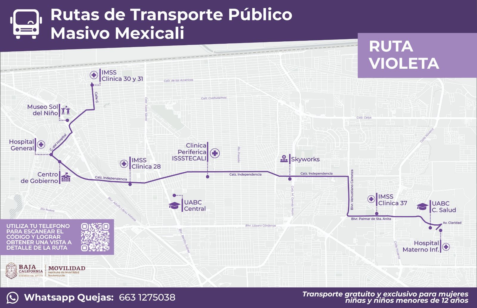 La Ruta Violeta inicia su recorrido en la esquina de Av. Sebastián lerdo de Tejada y Calle G, a la altura del Hospital de Especialidades del IMSS #30 y la Clínica 31, continuando hacia el Sur hasta Calle Herreros y Av. Comandante Alfonso Esquer hacia el Museo Sol del Niño, desde donde se dirige hacia Centro Cívico por Calle del Hospital pasando por el Hospital General de Mexicali y el Centro de Gobierno, continuando por Av. Independencia hacia la Central de Autobuses, la Clínica 28 del IMSS y pasando cerca de UABC Central y la Clínica Periférica de ISSSTECALI, continuando para pasar por la empresa Skyworks hacia Blvd. Venustiano Carranza.