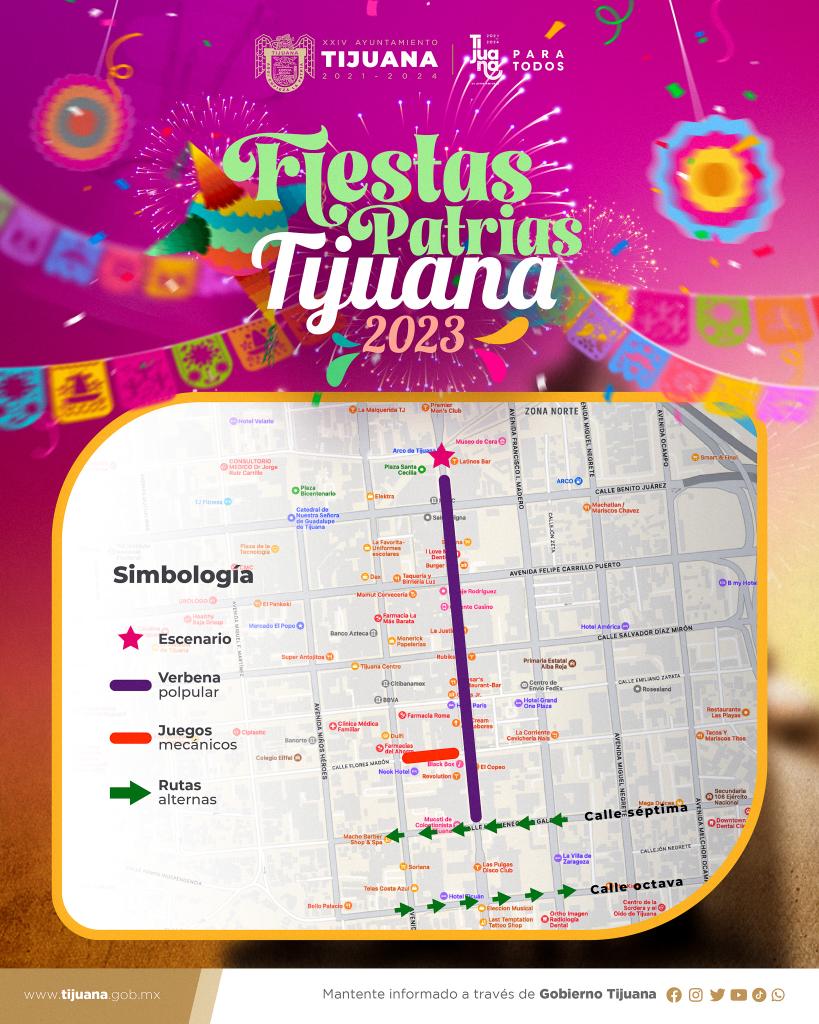 De igual manera se informa a los tijuanenses que a partir de las primeras horas del próximo viernes 15 de septiembre, permanecerán cerradas desde la calle Coahuila, hasta la esquina de la calle Hermenegildo Galeana (Séptima), sobre la avenida Revolución, espacio que será utilizado para la instalación de puestos de comida mexicana, entre otros, que formarán parte de la verbena popular preparada en el marco de los festejos patrios.