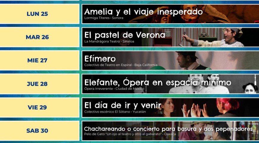 En Ensenada la semana comenzará con Natanam, el domingo 24 de septiembre; seguida por Amelia y el viaje inesperado, el lunes 25; El pastel de Verona, el martes 26; Efímero, el miércoles 27; Elefante, Ópera en espacio mínimo, el jueves 28; El día de ir y venir, el viernes 29; y Chachareando o concierto para basura y dos pepenadores, el sábado 30.
