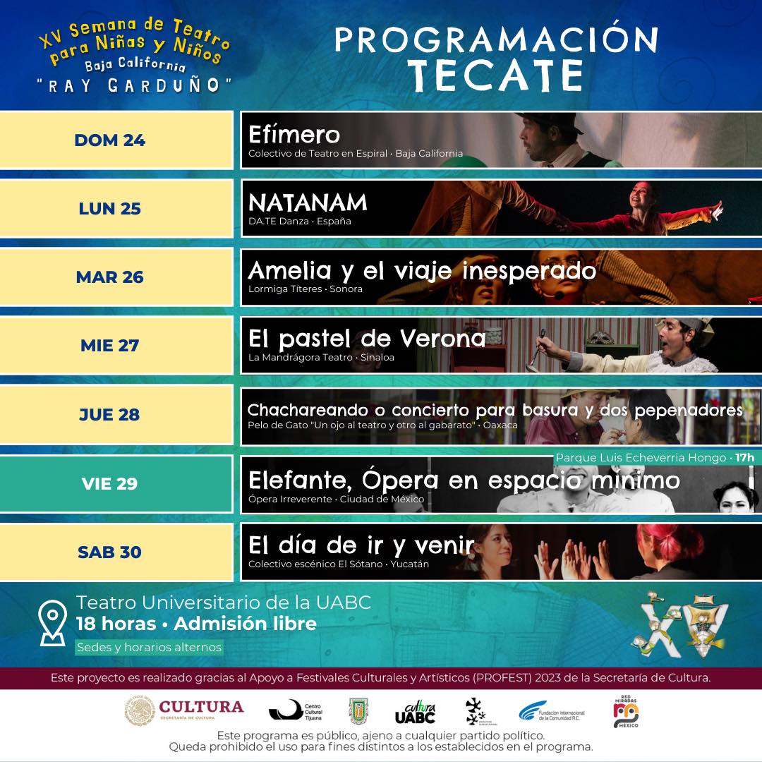 Mientras tanto, en Tecate, la programación arrancará con Efímero, el domingo 24 de septiembre; seguida por Natanam, el lunes 25; Amelia y el viaje inesperado, el martes 26; El pastel de Verona, el miércoles 27; Chachareando o concierto para basura y dos pepenadores, el jueves 28; y El día de ir y venir, el sábado 30. A excepción de las demás, la presentación del viernes 29 Elefante, Ópera en espacio mínimo se llevará a cabo en el parque Salvador Ornelas de la colonia Luis Echeverría “El Hongo” a las 17:00 horas.