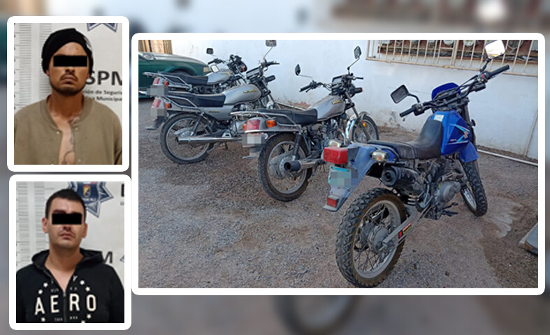 Mexicali, Baja California, a martes 24 de octubre de 2023 / Redacción.- La oportuna intervención de la Policía Municipal, permitió localizar y detener a Francisco Alfredo “N” de 33 años y Steven Jemis “N” de 34, quienes tenían en su poder cuatro motocicletas que habían sustraído del patio de una empresa ubicada en la colonia Alamitos.