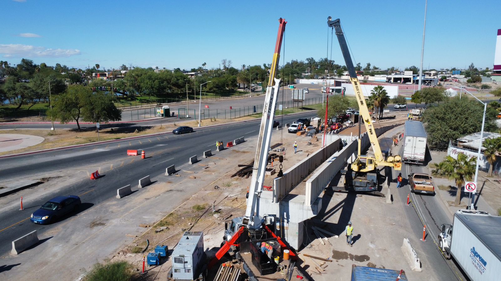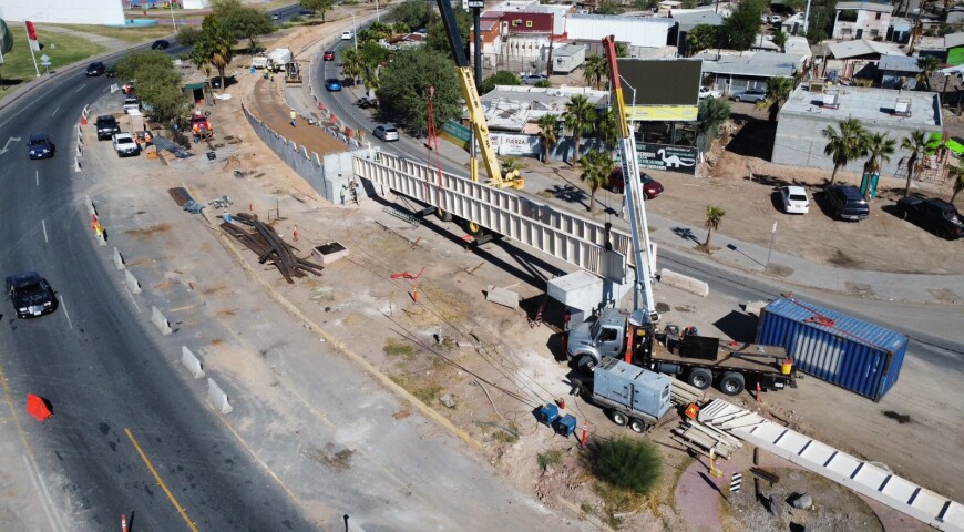 Mexicali, B.C. A 20 noviembre 2023 / Redacción.- Iniciaron los trabajos para montar las primeras trabes (vigas) del puente vial que se construye en RÃo Nuevo y Eje Central, informó la SecretarÃa de Infraestructura, Desarrollo Urbano y Reordenación Territorial (SIDURT).