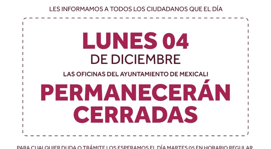 Mexicali, B.C. A 03 de diciembre 2023 / Redacción.- Se les informa a las y los mexicalenses que el dÃa lunes 04 de diciembre suspenderán las labores en las oficinas del Ayuntamiento de Mexicali debido a que se considera dÃa inhábil para los trabajadores y/o personal de base, confianza y eventual.