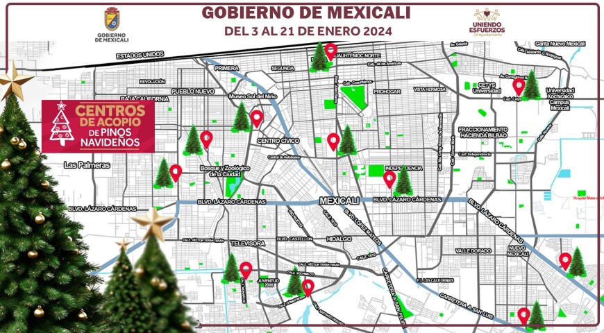 Mexicali, B.C. A 04 de enero 2024 / Redacción.- El Gobierno de Mexicali instalará 11 puntos de acopio en el que los ciudadanos podrán depositar sus pinos naturales después de las fiestas decembrinas y de fin de año.
