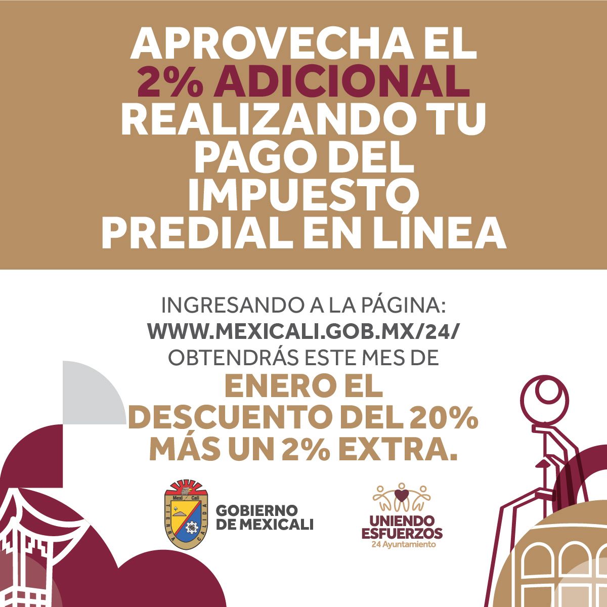 Mexicali, B.C. A 15 de enero 2024 / Redacción.- Brindando mayores beneficios a las y los ciudadanos cumplidos, el Gobierno de Mexicali encabezado por Norma Bustamante invitó a aprovechar el 2% de descuento adicional en el pago del impuesto predial en lÃnea.