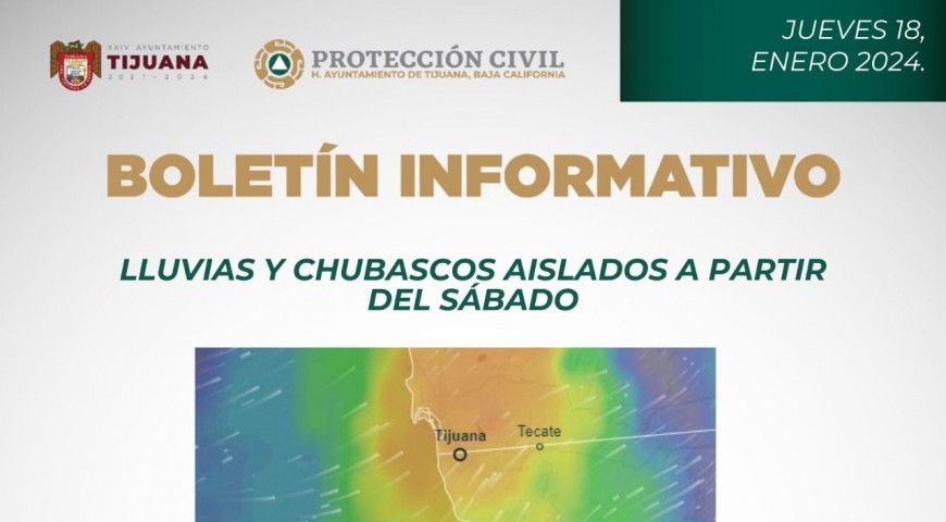 Tijuana, B.C. A 18 de enero 2024 / Redacción.- A partir del sábado 20 de enero se estarán registrando lluvias y chubascos aislados, condición que se podrÃa extender hasta la mañana del próximo martes.