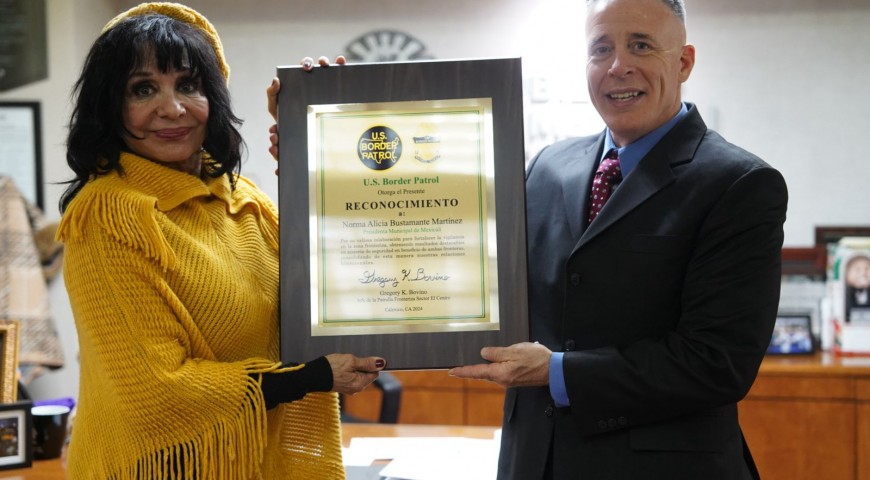 Mexicali, B.C. A 01 de febrero 2024.- La presidenta municipal Norma Bustamante recibió un reconocimiento por parte de U.S. Border Patrol destacando su apoyo en fortalecer la seguridad fronteriza.