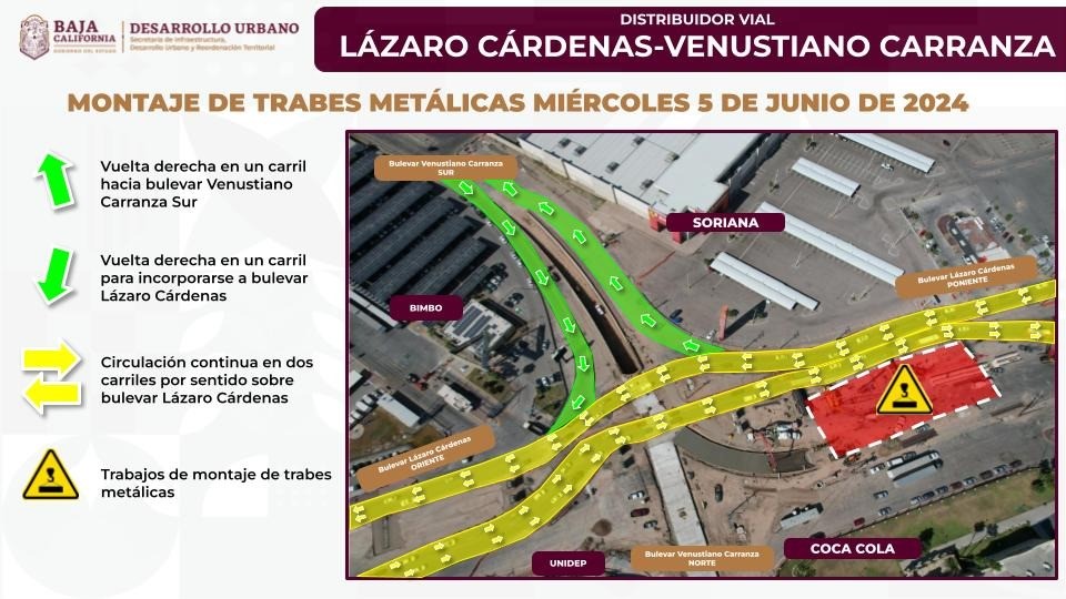 Mexicali, B.C. A 4 de junio 2024 / Redacción.- Como parte de los trabajos en la obra del Distribuidor Lázaro Cárdenas y Venustiano Carranza, la Secretaría de Infraestructura, Desarrollo Urbano y Reordenamiento Territorial (SIDURT), continuará con el montaje de trabes de acero en el lugar de trabajo a partir de este miércoles 5 de junio.