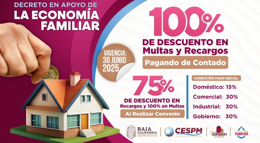 Mexicali, B.C. A 31 de marzo 2025 / Redacción.- La Comisión Estatal de Servicios Públicos de Mexicali (CESPM) recuerda a la población que el plazo para aprovechar la condonación del 100 % en pagos de contado y un 75 % en multas y recargos en pago a plazo a través de convenio por el servicio de agua potable vence el próximo 30 de junio de 2025. Esta medida representa una oportunidad significativa para que los usuarios regularicen su situación y actualicen sus cuentas de agua potable.
